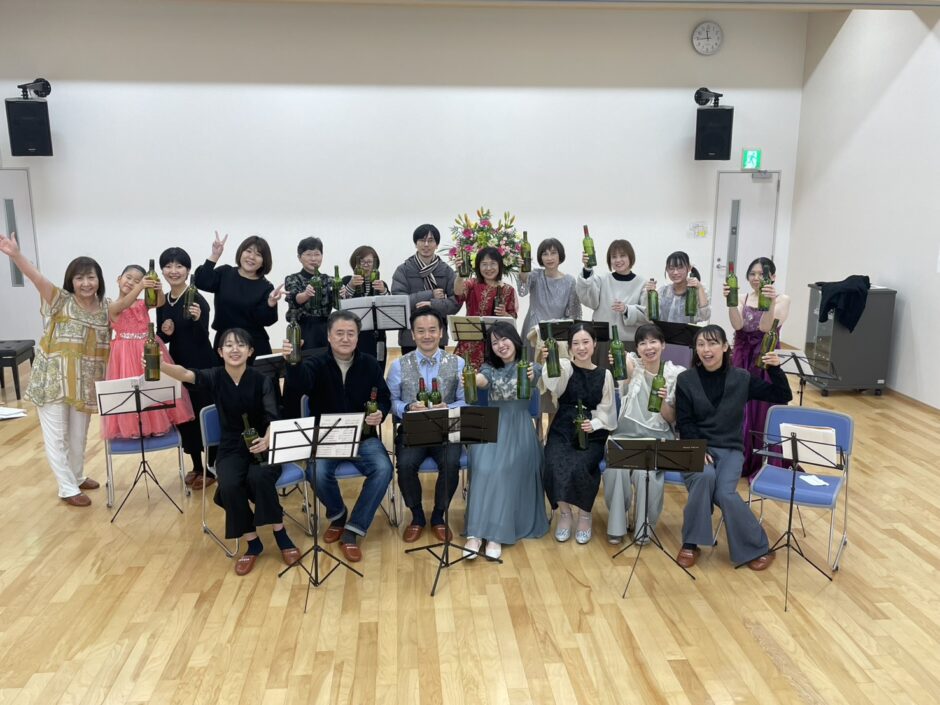 最初はワインの瓶での合奏。子供達のお母様にもお手伝いいただき、ハンドベルならぬハンド瓶❣️
